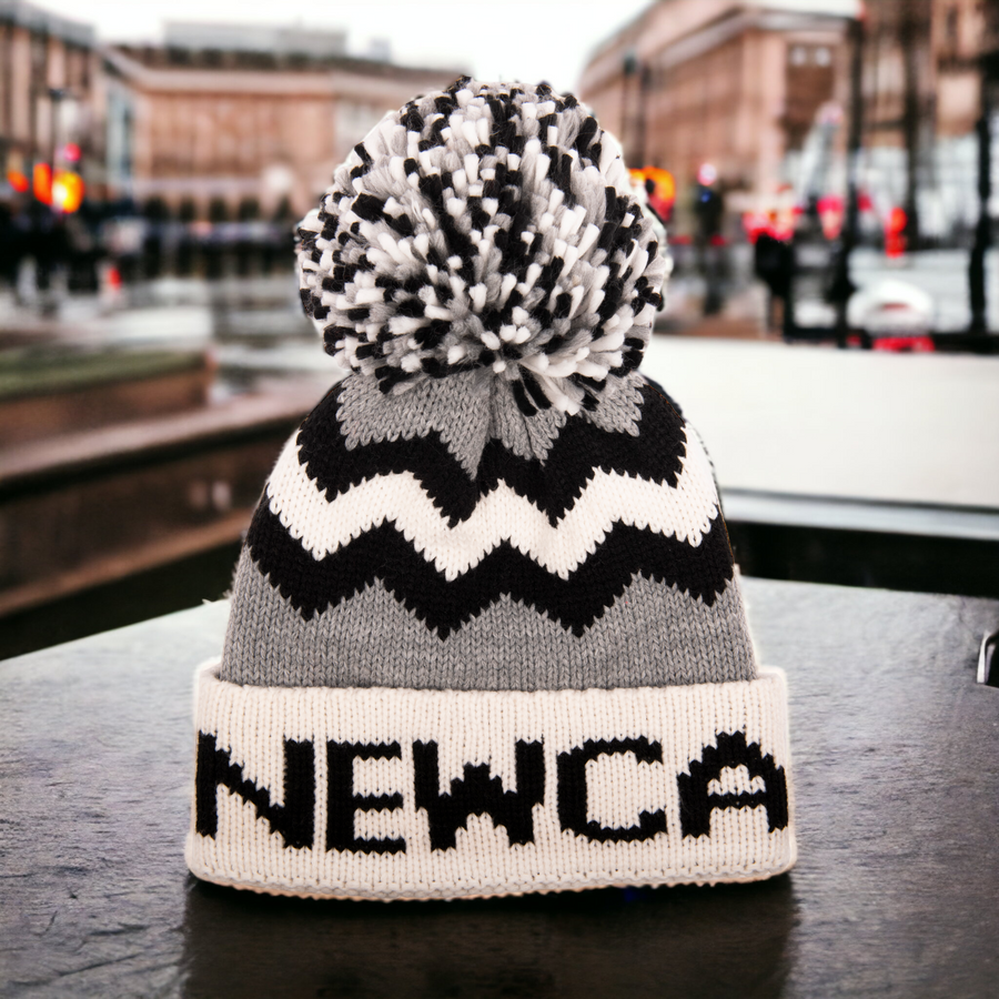 - Black, white, and grey beanie hat with "Newcastle" across the front